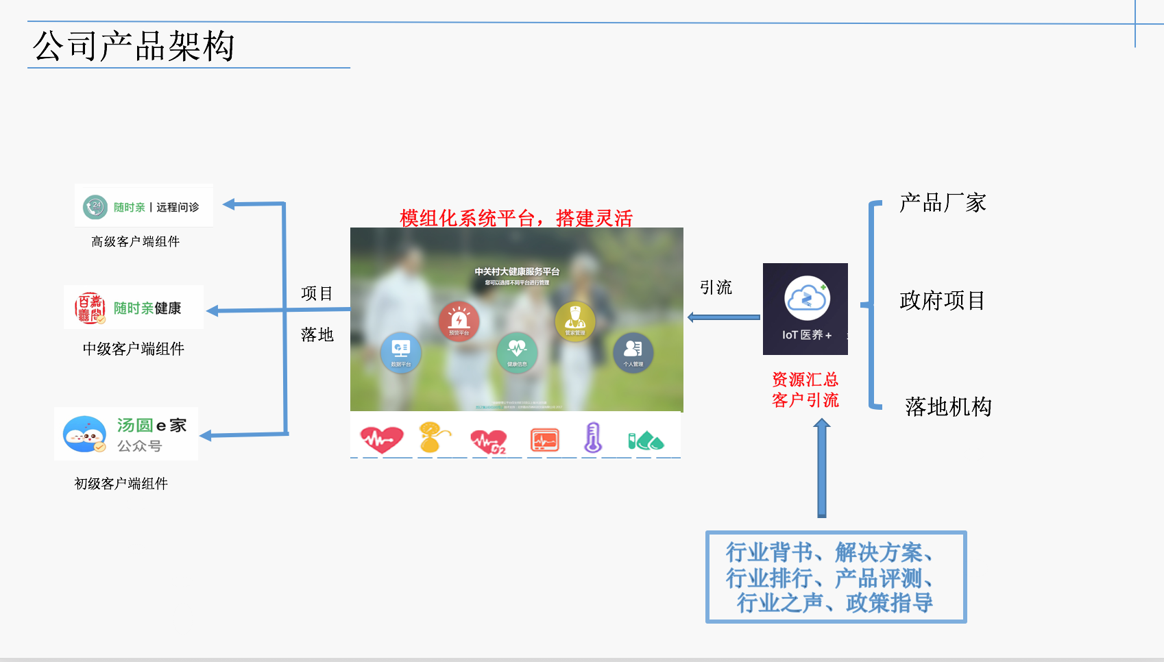 公司致力于運(yùn)用國(guó)內(nèi)外高科技手段,以現(xiàn)代物聯(lián)網(wǎng)技術(shù)為核心,完成健康管理信息化平臺(tái)的研發(fā)、推廣和建設(shè),整合大健康資源,并完善服務(wù)體系,為政府、企業(yè)機(jī)構(gòu)、社區(qū)、家庭、個(gè)人提供第三方健康管理信息平臺(tái)和智慧養(yǎng)老解決方案。